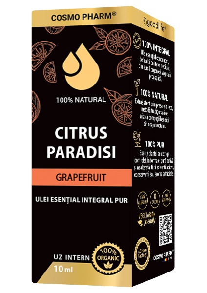 The product contains: 100% NATURAL PURE INTEGRAL ESSENTIAL OIL of Grapefruit. Obtained by cold pressing from the peel of the fruit of the plant Citrus paradisi.